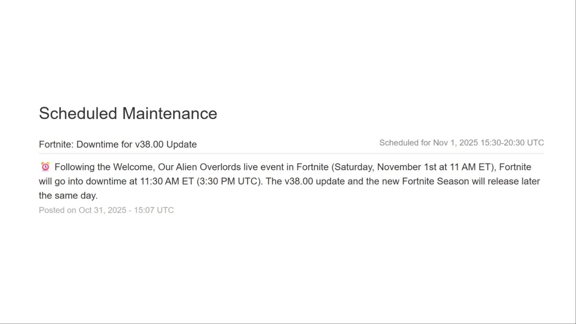 Epic Games объявила, что их серверы будут отключены в субботу, 1 ноября, в 11:30 по восточному времени. Это отключение начнется через 30 минут после начала живого мероприятия с участием The Simpsons.