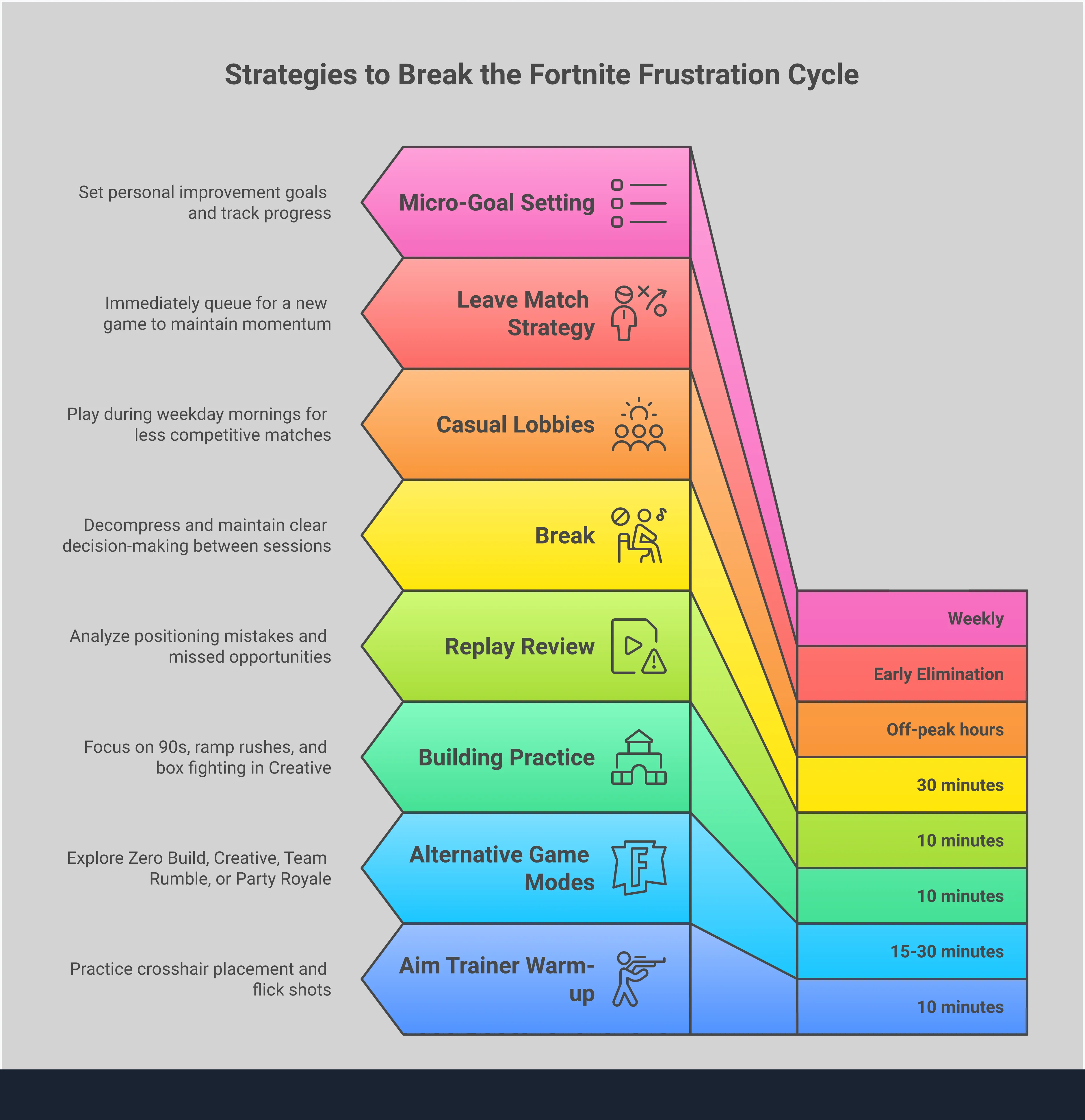 - Осознайте основные трудности игры: Большая часть разочарования в Fortnite происходит от её уникальной механики строительства, которая создает высокий порог вхождения, и системы подбора игроков, которая может привести к чрезвычайно конкурентным матчам.