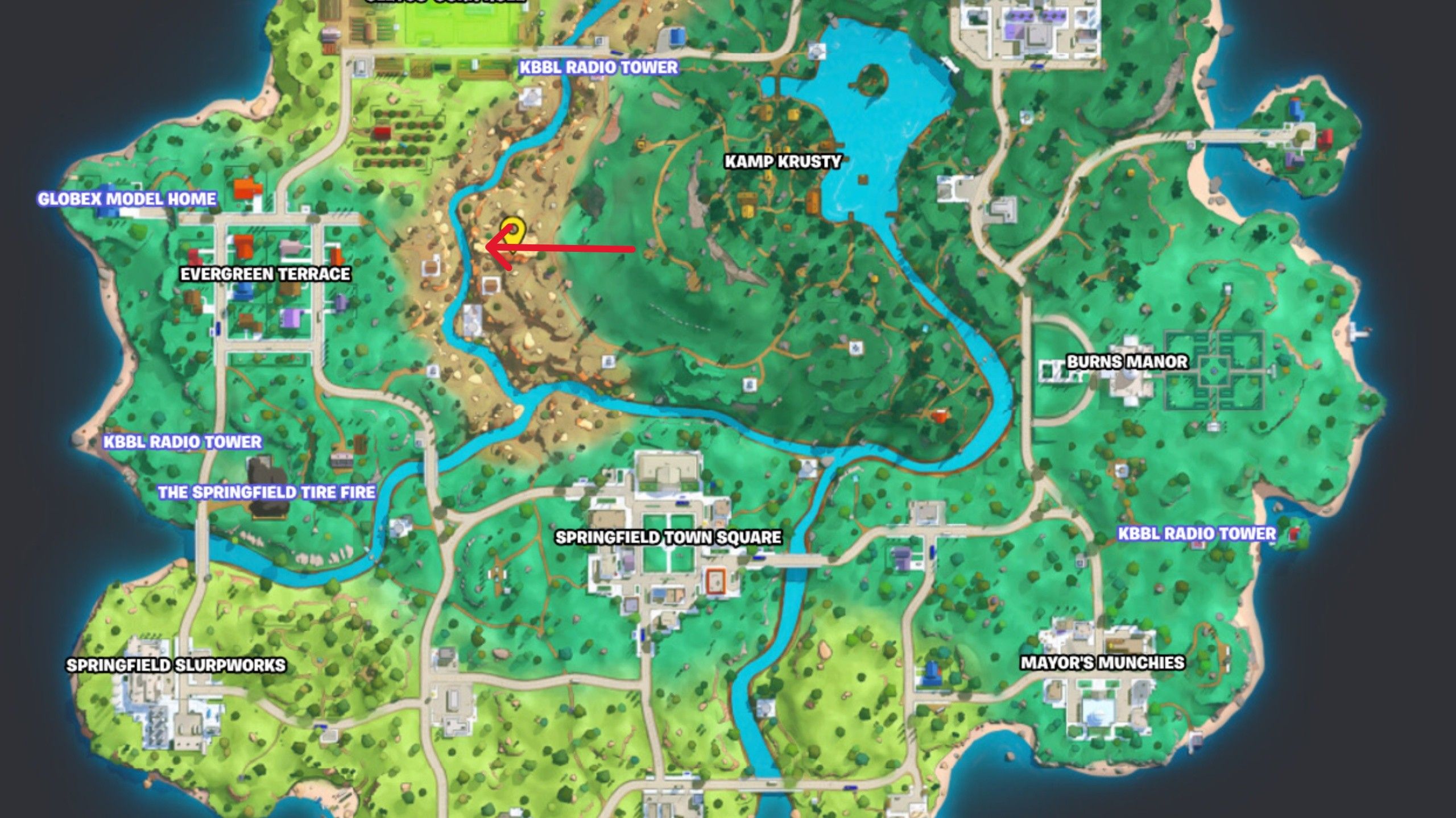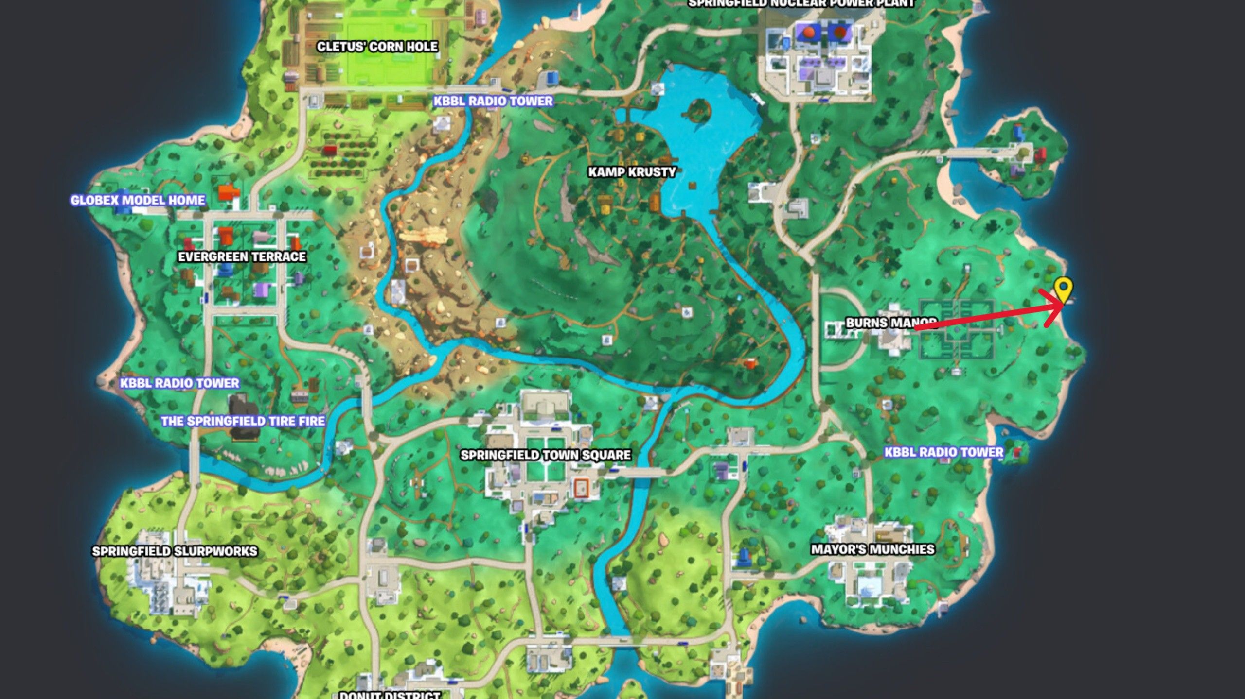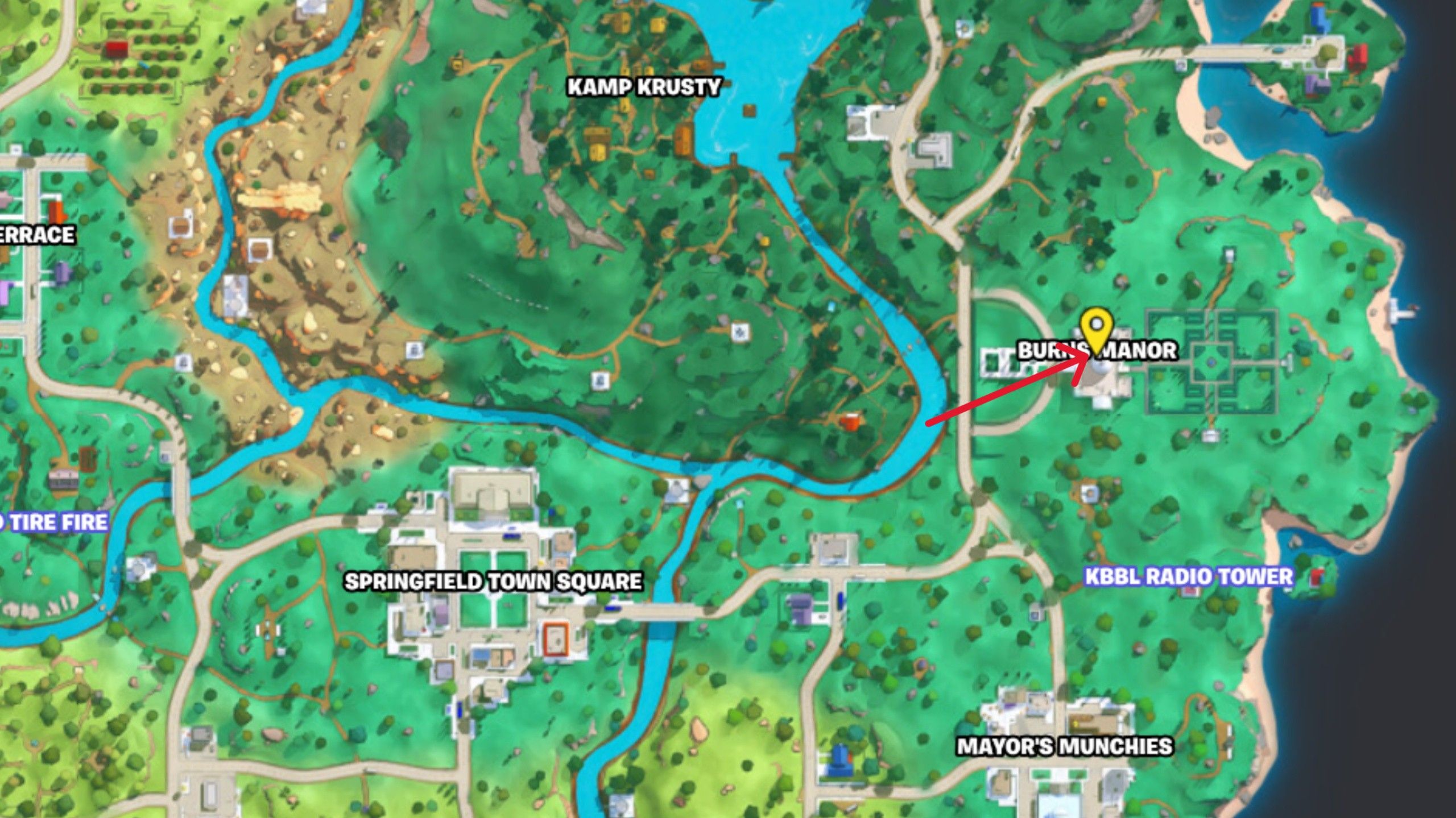 Особняк Бернса — это самое правое здание. Внутри, первая комната слева содержит стол мистера Бернса. Нажатие красной кнопки на этом столе выпускает стаю доберманов, которые будут сражаться за вас и охранять здание. Чтобы использовать это эффективно, высаживайтесь прямо из Fortnite в начале матча, потому что активировать кнопку может только один игрок за игру.