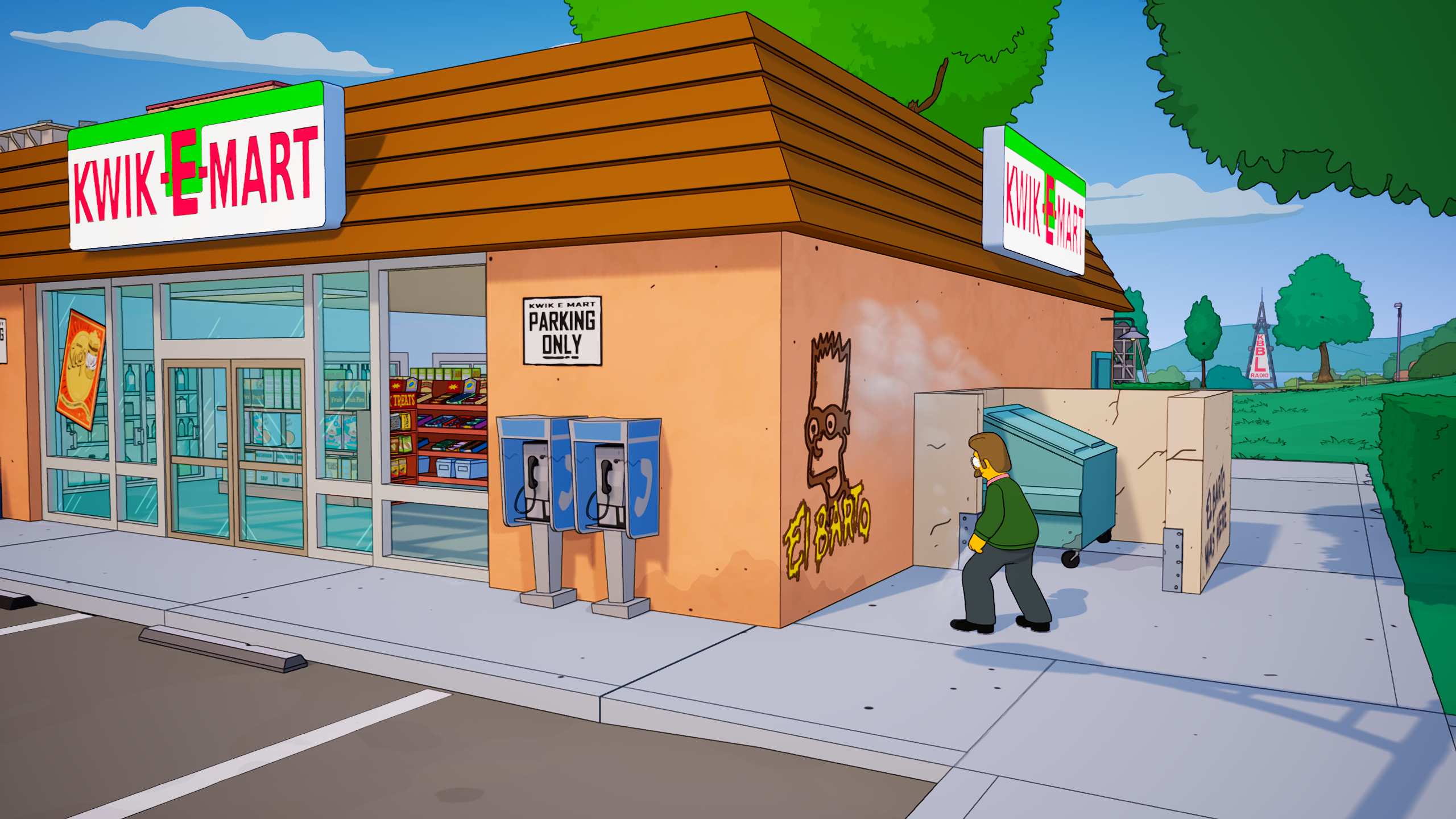 Вы можете разрисовать граффити в нескольких местах вокруг Спрингфилда, но самое простое место для этого — площадь Спрингфилд-Таун. Отправляйтесь в Kwik-E-Mart и подойдите к стене с южной стороны, рядом с мусорными баками. Там вы можете использовать граффити ‘El Barto’ из вашего колеса эмоций, чтобы быстро выполнить задание.