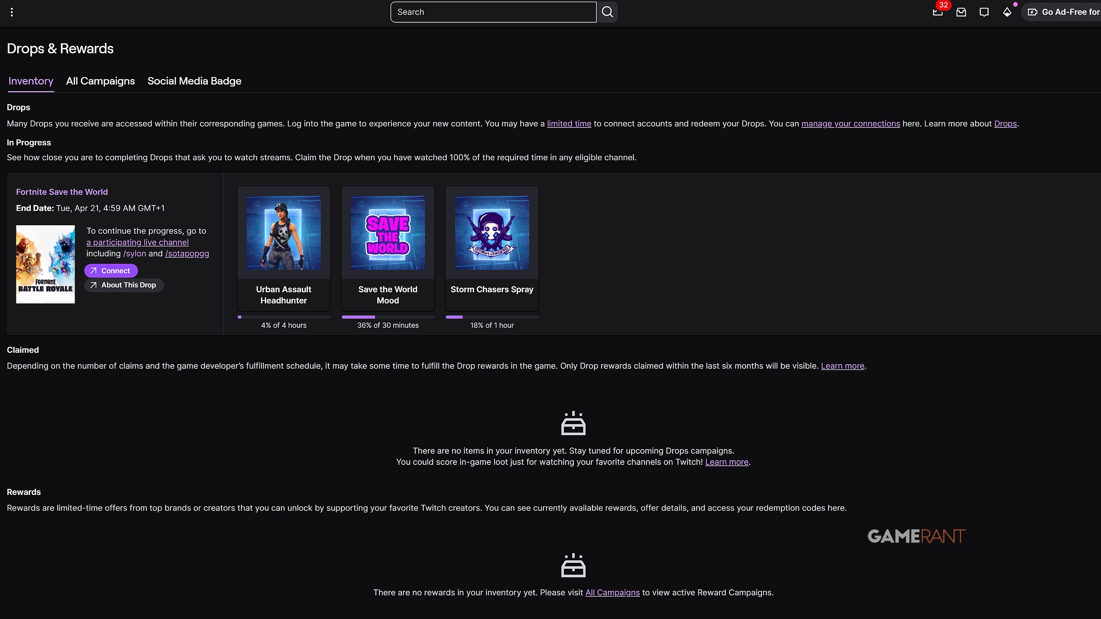 После выполнения требований вы можете получить свои награды через свой инвентарь Drops. Эти предметы обычно появляются в Fortnite немедленно. Иногда, однако, это может занять немного больше времени. Вы можете получить Twitch Drops для Save the World сейчас до 21 апреля в полночь, и у вас есть время до 28 апреля, чтобы забрать их.